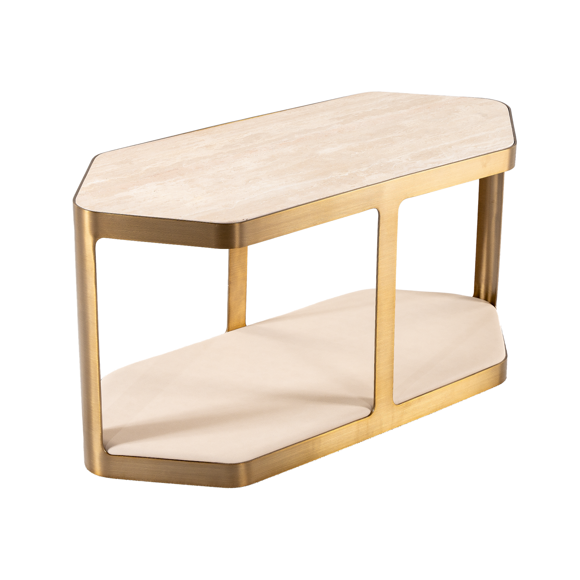 تتميز طاولة القهوة السداسية الفريدة هذه بوجود سطح من حجر الترافرتين وقاعدة من الجلد الصناعي وطبقة نهائية من البرونز المصقول مما يجعلها القطعة المركزية المثالية لمساحة المعيشة الخاصة بك.