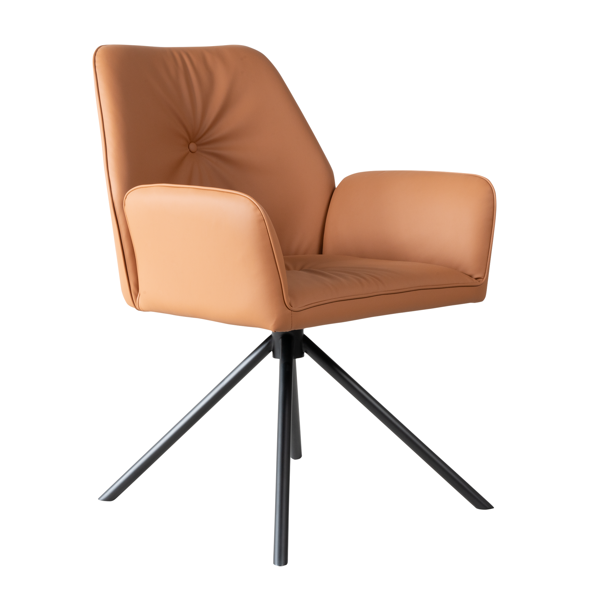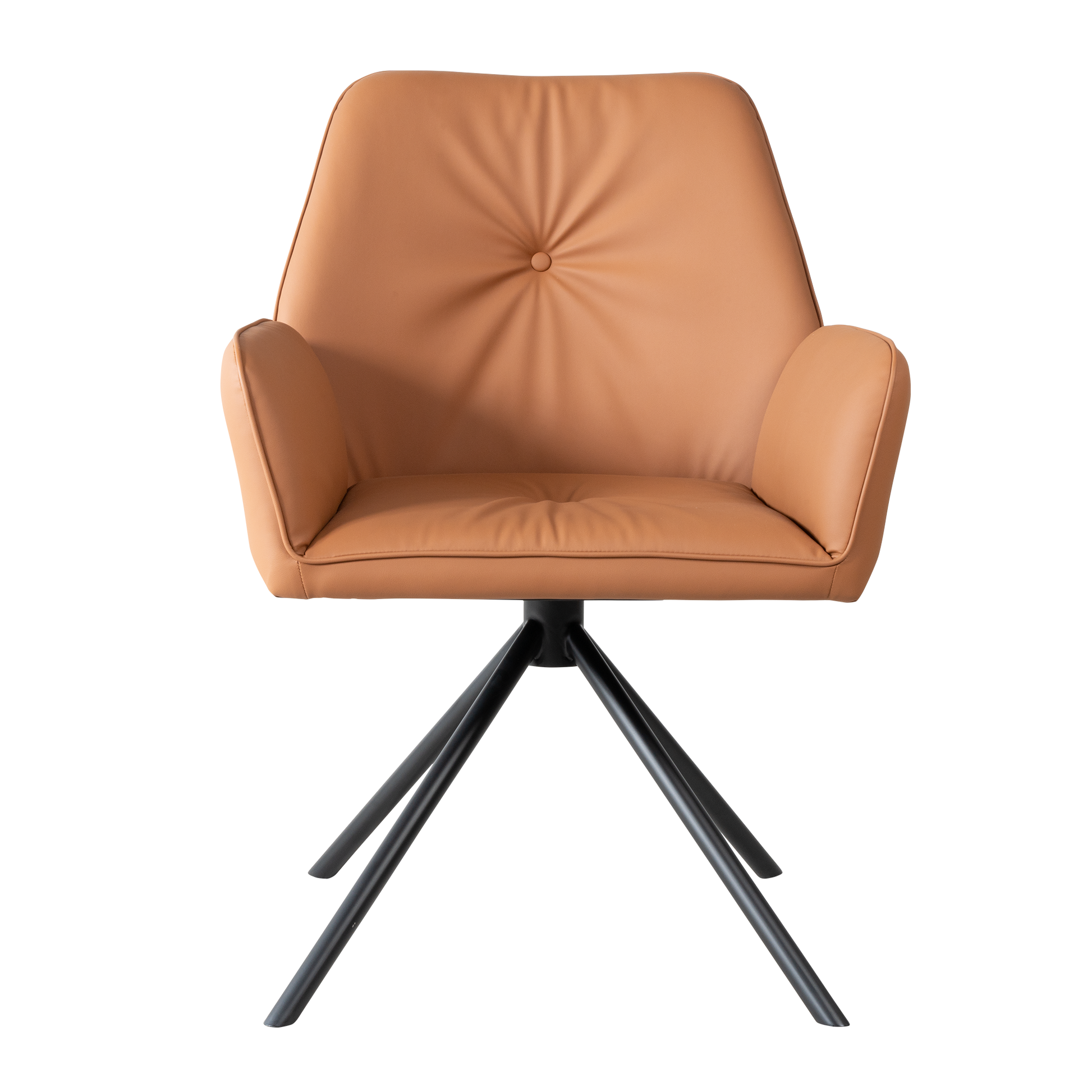 إن تنجيد كرسي James Dining Chair المصنوع من الجلد الصناعي البني الفاخر والأرجل المعدنية السوداء البسيطة يجعلها قطعة أنيقة لإضافة لمسة عصرية إلى مساحة تناول الطعام.