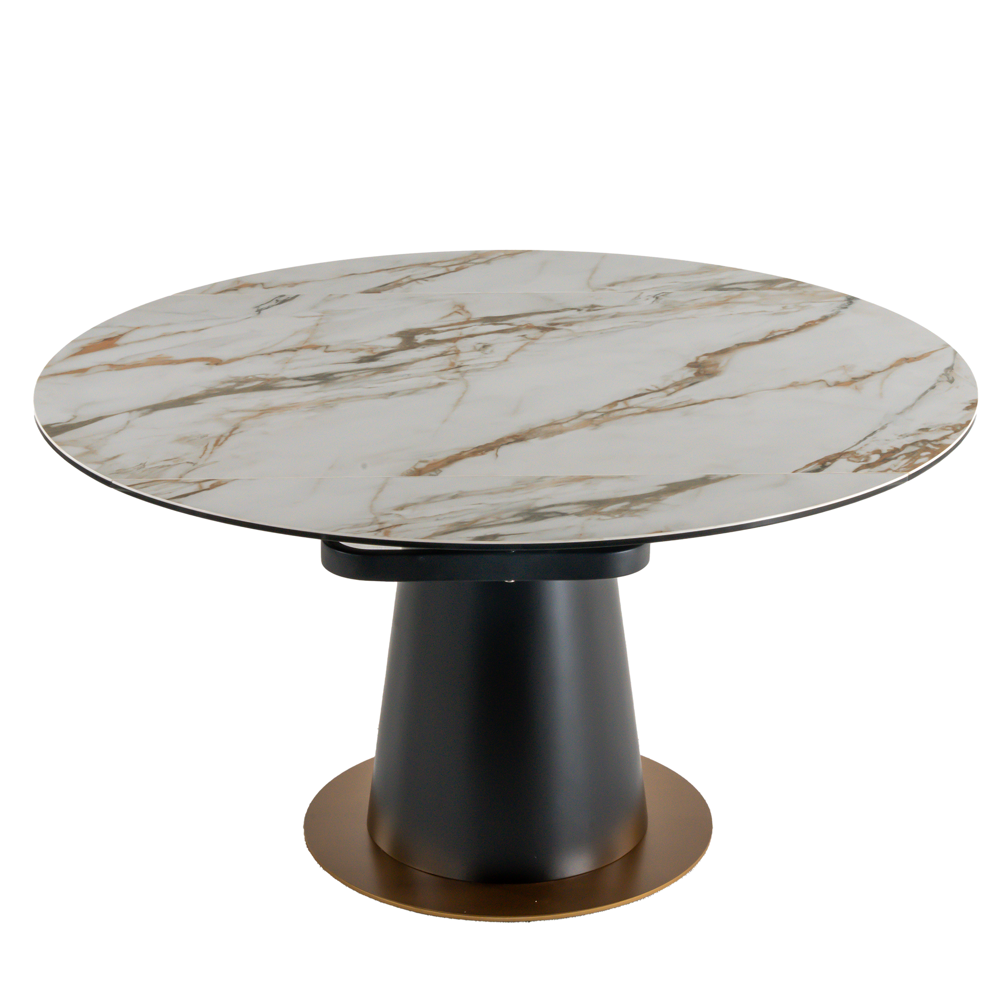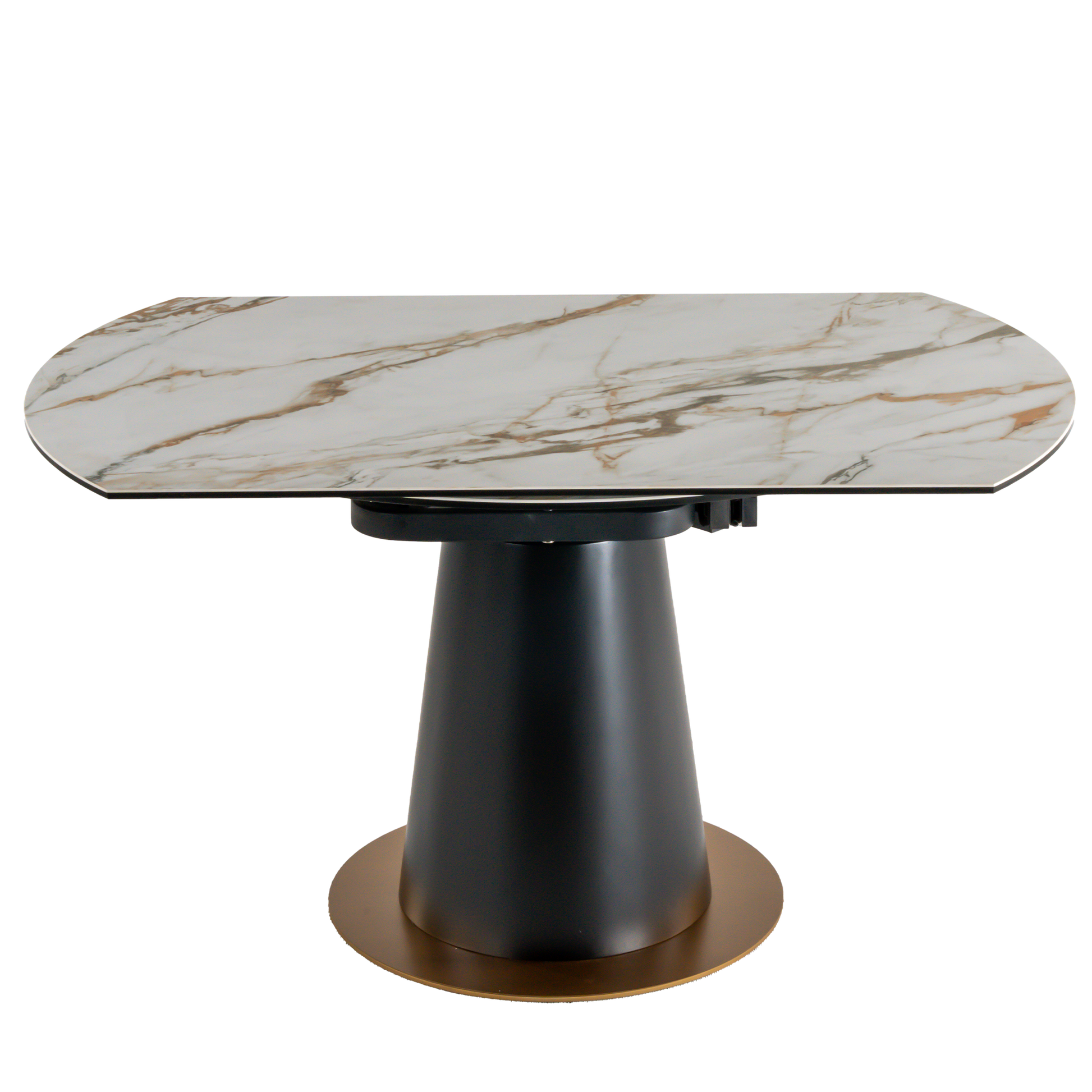 قم بتحويل مساحة تناول الطعام لديك باستخدام وظائف طاولة Josaphine 2 في 1. قم بالتبديل بسلاسة بين الشكل المربع الكلاسيكي والشكل الدائري الحديث مع سطح سيراميكي، وكل ذلك مدعوم بقاعدة من النحاس المصقول الأنيق.