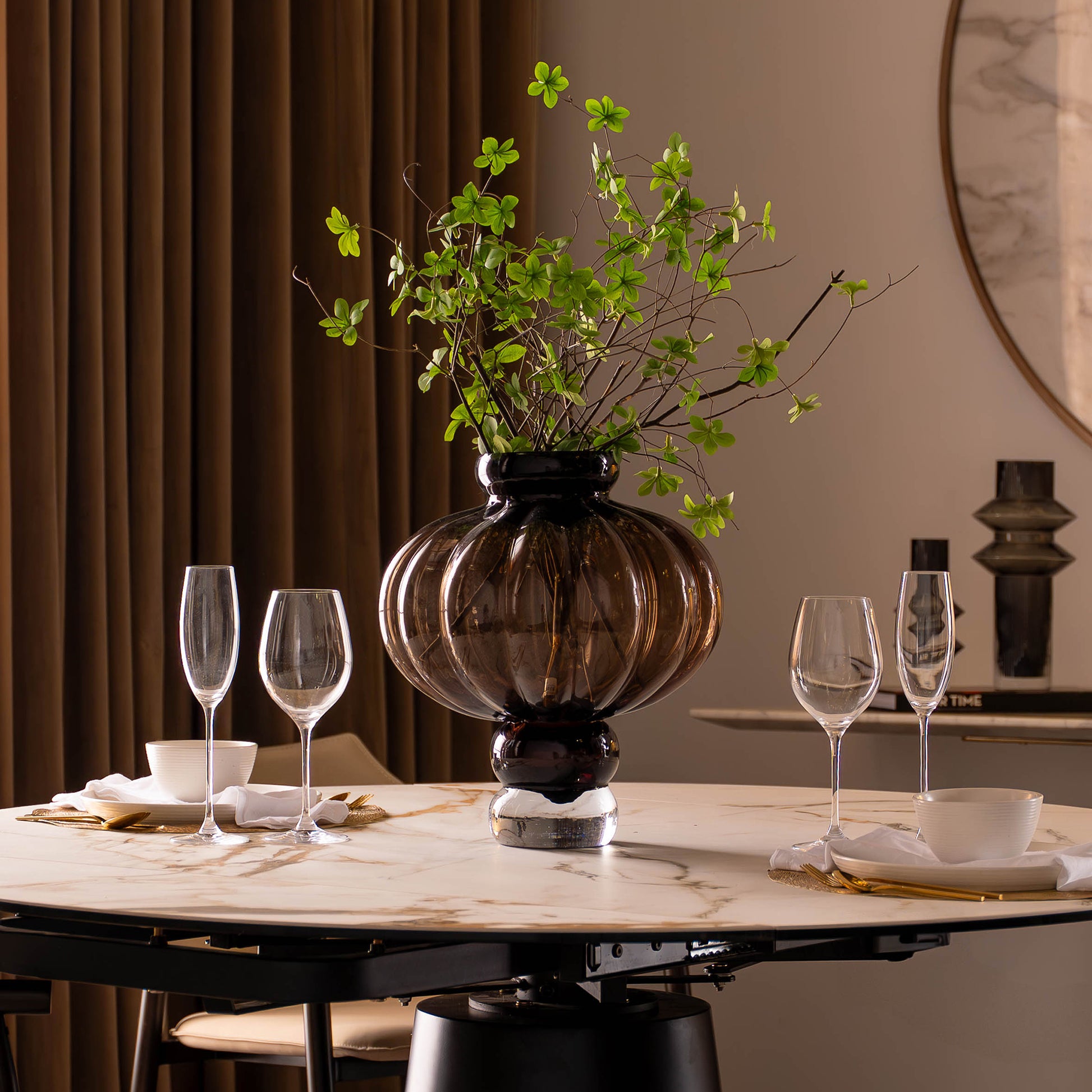 Elevate your decor with the Drab Pumpkin Vase. Its modern design and elegant craftsmanship make it a standout piece, perfect for adding a touch of sophistication and charm to any room.