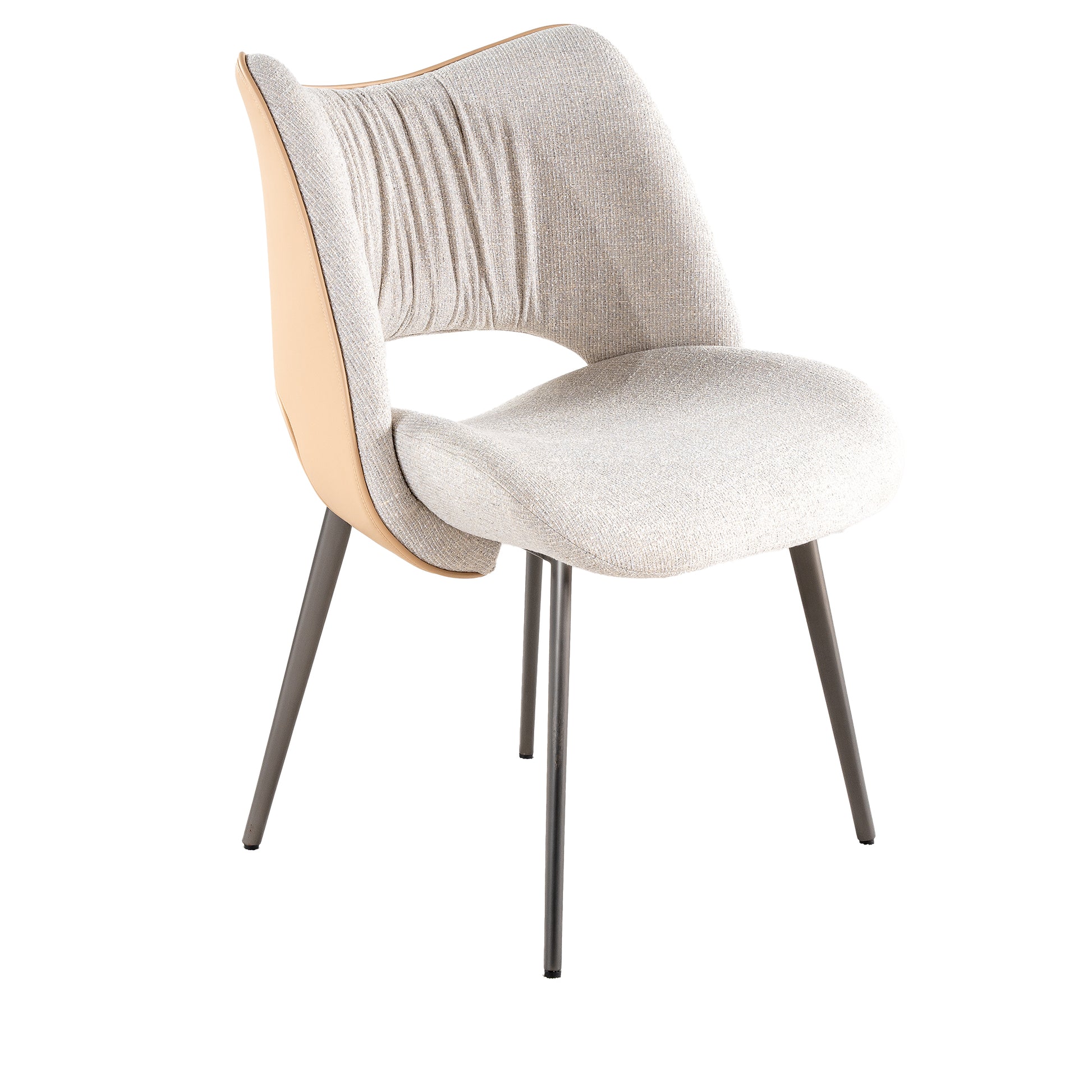Experience dining in luxury with our Reign dining chair. The fusion of chic gray fabric, lavish beige leather back, and sleek stainless-steel legs exudes modern elegance. Elevate your space with this high-quality, statement piece.